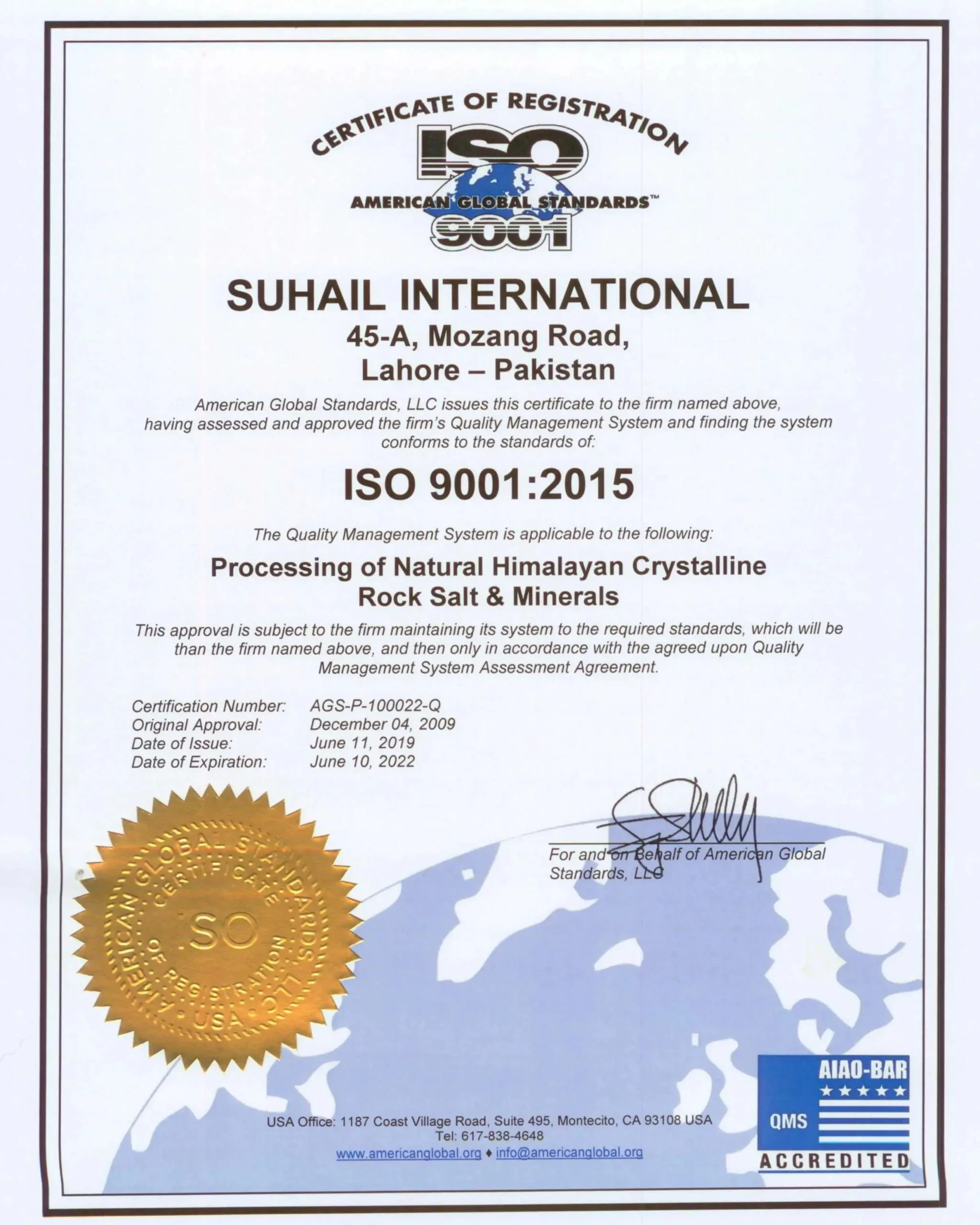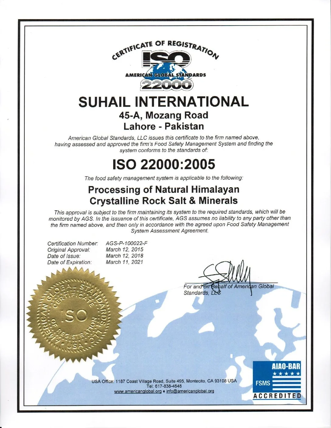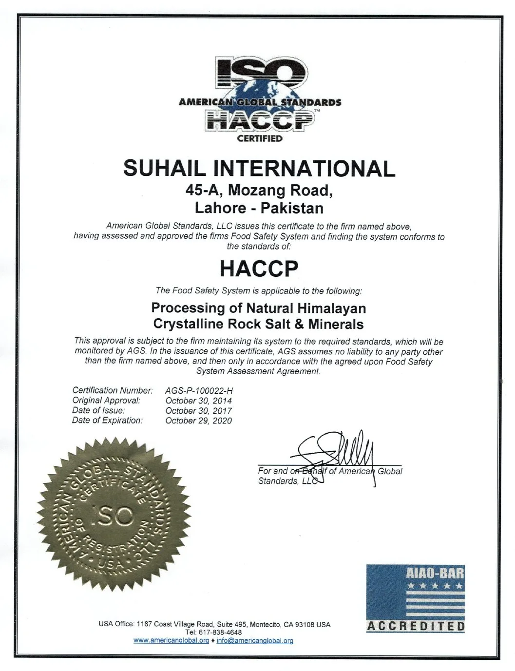 Suhail International is one of the leading manufacturers and exporters of Himalayan Crystal Salt in Pakistan. It was established in 1995, which has now grown into the largest organization of Himalayan Crystal Salt products. We are ISO 9001:2008 & HACCP Certified and FDA approved organization which assures superior quality management system and its high level of safety that governs the manufacturing and processing of all Himalayan Crystal Salt products.